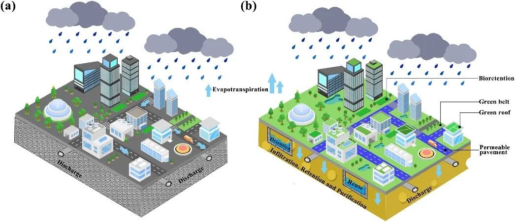 (a)传统城市建设模式与(b)海绵城市建设中的不同水文过程