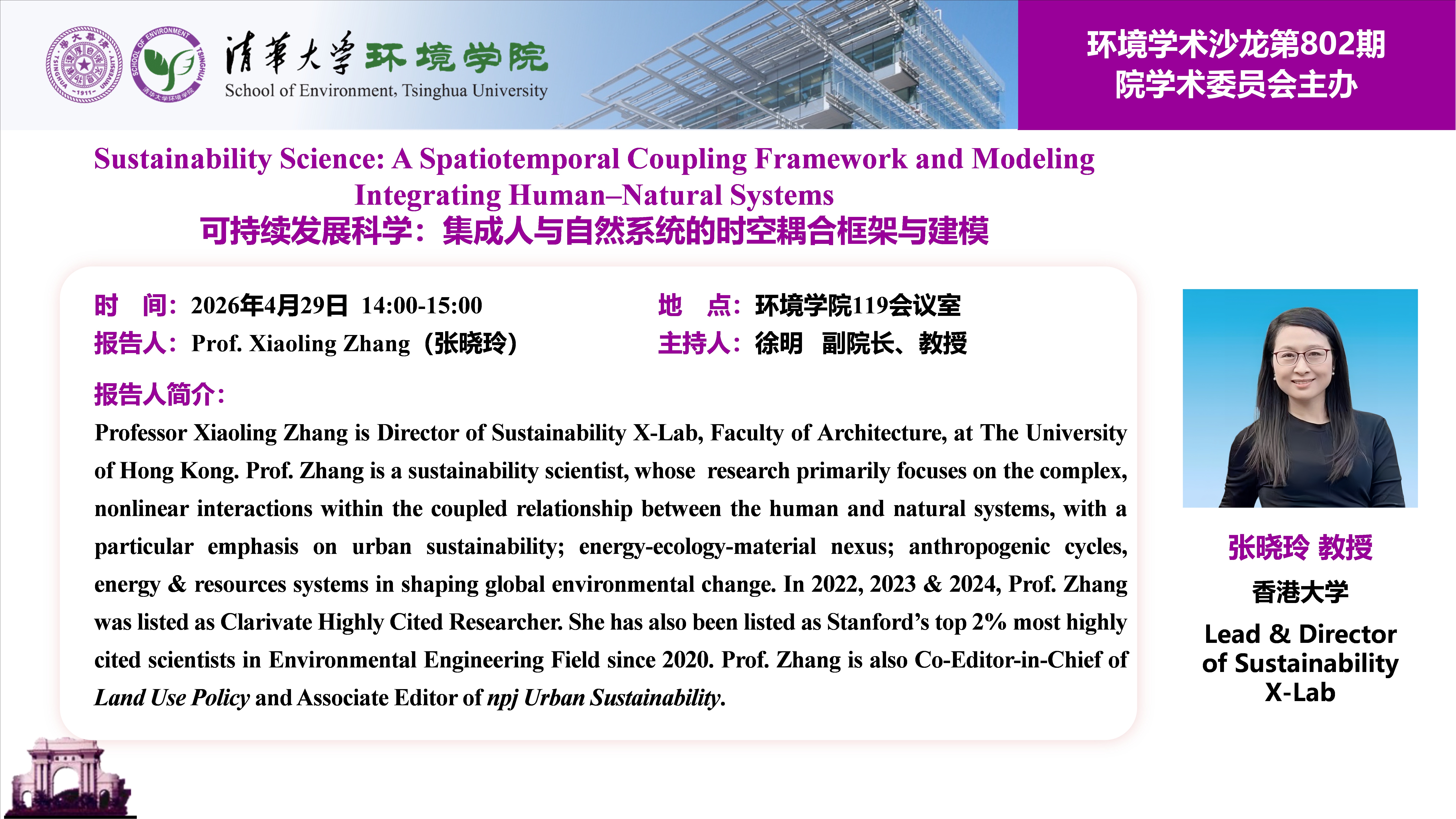 报告人:Prof. Xiaoling Zhang, Director of Sustainability X-Lab at The University of Hong Kong