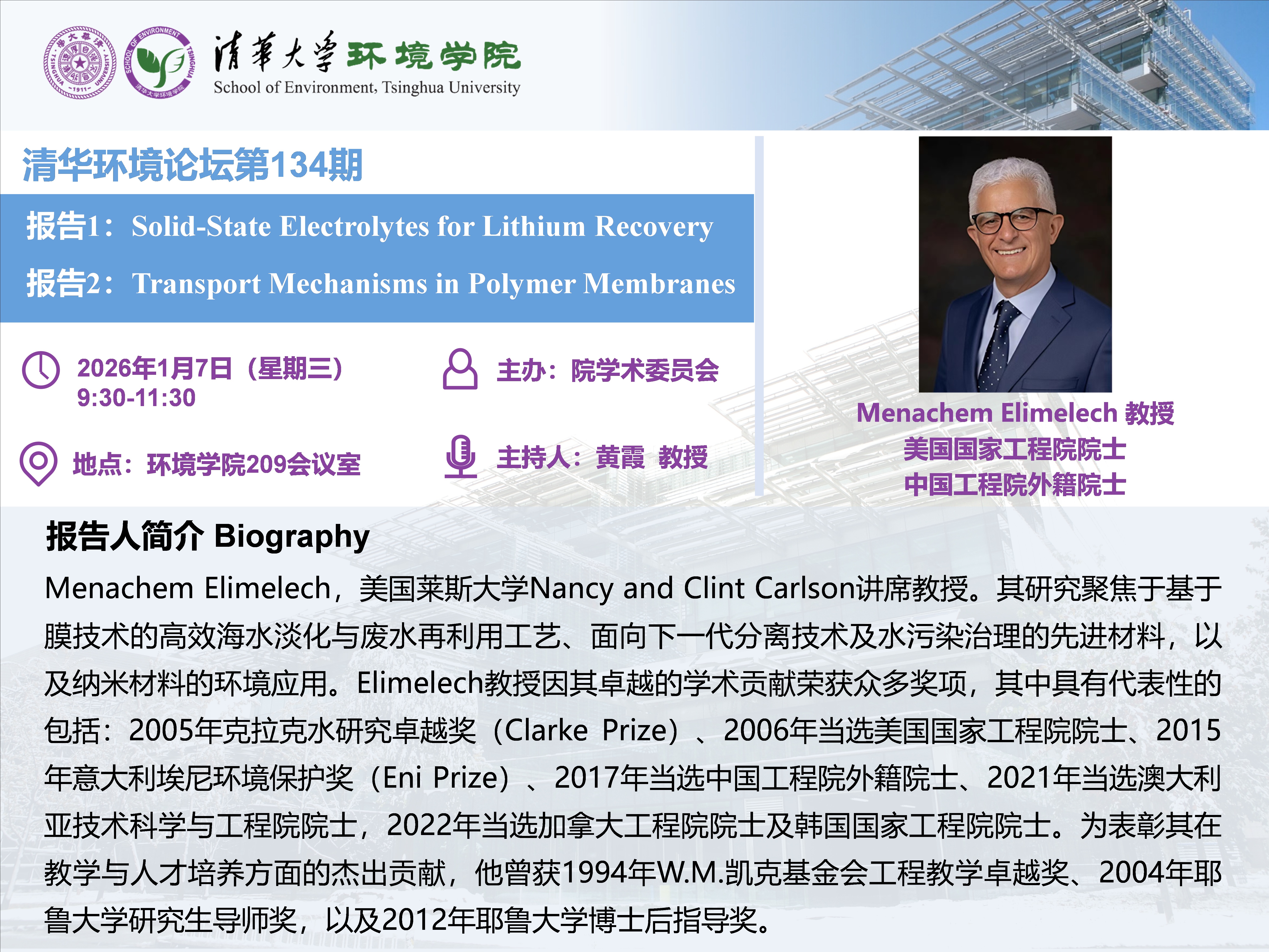 报告人:Menachem Elimelech,美国莱斯大学Nancy and Clint Carlson讲席教授,美国国家工程院院士,中国工程院外籍院士
