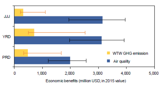 图3:未来十年东部三大城市群电动汽车发展的空气质量改善和健康风险降低的货币化效益和温室气体减排的货币化效益