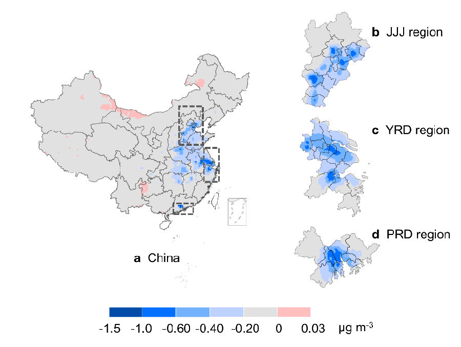 图1:电动汽车基准推广情景对中国年均PM2.5浓度的影响(左);在机动化比例和人口密度较高的东部三大城市群浓度削减显著(右)