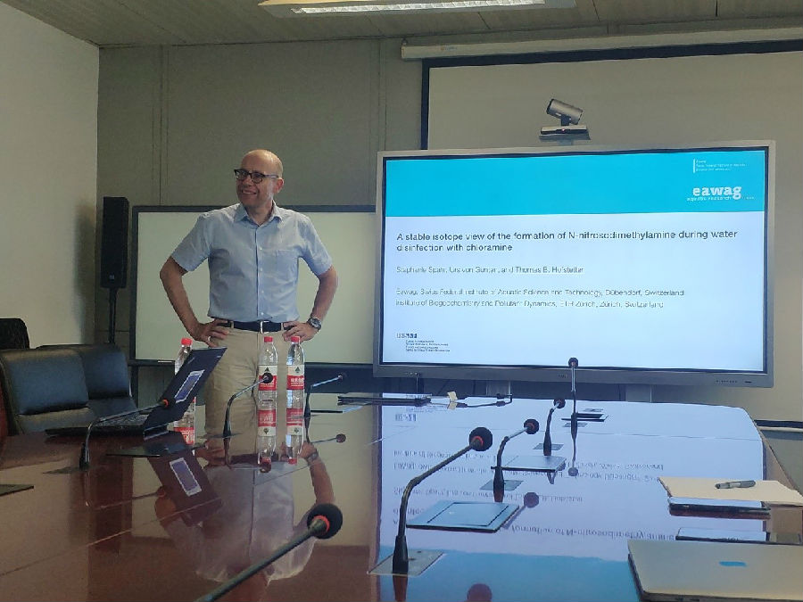 2019年8月21日电(通讯员 邱玉)8月19日下午,瑞士联邦水科学与技术研究所(Eawag)环境化学部门高级研究员Thomas B. Hofstetter做客成人自拍视频第516期,作了题为《从稳定同位素角度研究氯胺消毒过程中亚硝基二甲胺的生成机理》(A stable isotope view of the formation of N-nitrosodimethylamine during water disinfection with chloramine)的学术报告。本次沙龙由饮用水安全教研所陈超副研究员主持,10余名师生听取了报告。