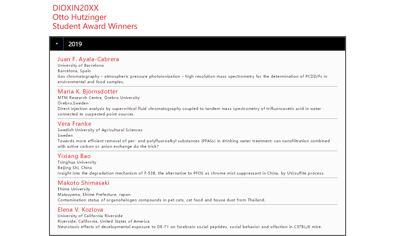 Otto Hutzinger Student Presentation Award是以会议创立者、著名环境化学家Otto Hutzinger教授的名字命名,用以表彰参加国际二噁英年会的优秀参会学生的奖项。每届会议共评选出6名获奖者,分别从三个大类别中各产生2名,包括:源和分析,存在(包括:迁移、转化和修复),人类暴露、毒理和风险评估。