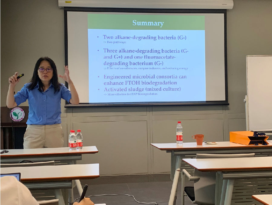 Chu教授首先介绍了自己科研团队的研究方向及领域,主要以环境生物技术为研究基础,重点关注水、土壤和能源领域的环境问题,旨在采用生物技术手段解决实际问题。随后,Chu教授简单介绍了全氟和多氟烷基化合物(PFASs)的性质,并由此引出对其前体物氟调醇(FTOHs)的研究介绍。Chu教授从氟调醇的化学性质、分子结构、生产使用现状等方面对研究背景做了介绍,并提出了生物降解氟调醇的研究设想。研究团队选取了两种菌群,发现均能够有效降解氟调醇,并对降解过程进行了产物分析,对降解路径进行了原理阐述。在此基础上,提出了构建人工生物群落以增强生物降解效果的假想,并通过实验进一步验证说明。讲座结束后,在场师生踊跃提问气氛热烈,与Chu教授进行了深入的沟通与交流。
