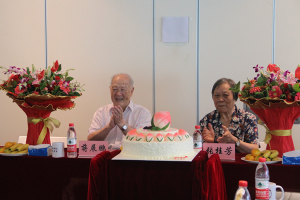 向张桂芳、蒋展鹏两位先生送上了贺礼,青年教师向寿星献花。