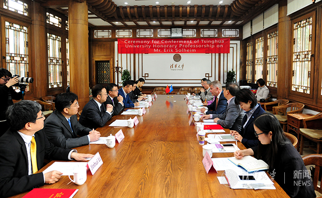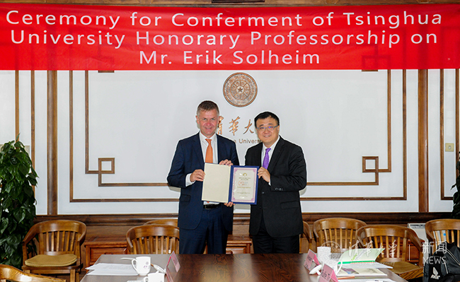 埃里克·索尔海姆对杨斌副校长的热情接待表示感谢。他说,清华大学在全球高校中享有崇高声誉,此次被授予名誉教授是他本人的重大荣誉。他会在接下来的日子里努力促进双方的合作交流。