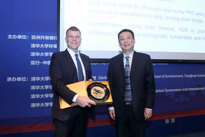 党委书记刘毅向史蒂芬·格罗夫赠送清华环境论坛纪念盘
