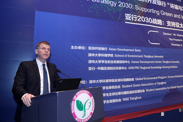 报告厅作了题为《亚行2030战略:支持亚太地区绿色和共享发展》的报告。刘毅主持报告,一百余名师生听取报告。格罗夫在报告中指出,亚太地区在过去几十年实现了经济快速增长和收入水平上升,但也面临收入不平等、环境污染、气候变化和人口老龄化等新的挑战。亚行2030战略旨在支持亚太地区实现可持续发展目标和强化应对气候变化行动,与中国坚持绿色和共享的发展理念一致。随后,Stephen P. Groff先生介绍了亚行支持中国治理环境污染与应对气候变化的主要项目,包括京津冀地区大气污染控制、长江经济带建设及私营部门业务等。亚行通过资金支持、技术援助和知识共享,帮助中国更好实现绿色和共享发展。报告结束后,现场师生与格罗夫进行了热烈的交流。