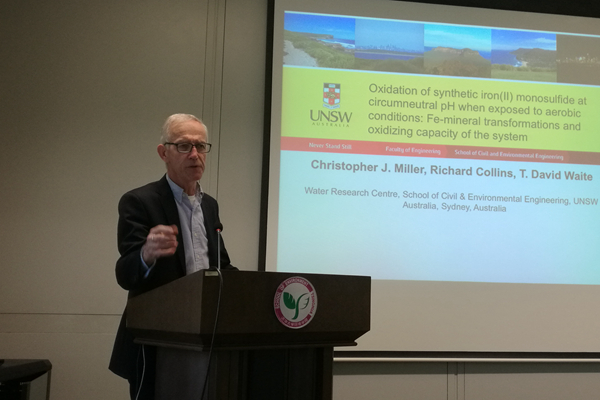 Waite教授重点介绍了他对于金属媒介氧化还原过程的机理以及离子和电容性去离子吸附脱盐技术的研究工作。其主要包括四部分内容,首先针对醌类化合物作为催化剂在金属离子还原过程中的作用机理,探讨了光照等因素对反应速率的影响,对于了解人体中的醌类化合物的反应具有指导意义;其次,介绍了硫铁化合物在不同pH下的转化过程,发现了FeS在O2参与S、Fe元素循环介导时,有H2O2的产生,利用XANES对铁氧化物进行了表征,提出了选择评价指标为R因子和X2;接着,Waite教授介绍了铁和磷元素在膜生物反应器中的固体形态分布;最后对电容性去离子脱盐技术进行了介绍,针对不同的加电模式对脱盐性能的影响、脱盐过程中的热效应和在流动电极型脱盐过程中的氧化还原反应等问题进行了详细说明。在讲座结束后,Waite教授与到场的师生进行了深入的沟通与交流。