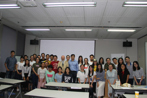 在与Brice Lalonde先生的互动环节中,同学们就全球环境治理以及个人未来发展两个方向进行了提问。国际班同学提出:“全球水资源问题相比气候变化等问题更具有区域性的特点,如何运行和管理相关的国际组织?”Lalonde先生认为,全球水环境管理与水中化学品的管理密不可分,而对于化学品污染的管理可以通过对化学品的生产和市场的管制以及扩大公众参与的方式来实现。另一方面,他也就《巴黎协定》谈了自己的看法,他认为《巴黎协定》的成功之处是让更多的利益相关方可以参与进来,但当前的INDCs(国家自主贡献)的制定需要更加的透明和标准化(如确定起始年限以便比较国家间的努力)。而对于同学们未来的发展,他认为同学们可以将环境关注融入到各个工作领域,从而创造更多的工作机会;另一方面,同学们要怀有坚定的信念,这样才可以感化更多的人加入到环境事业中来。同时他也认为,全球环境管理需要注入新的思想和理念。